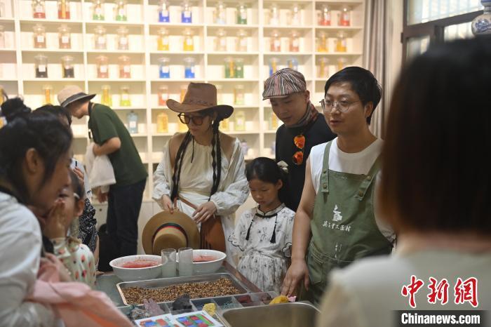 8月20日,甘肅敦煌莫高里工匠村內(nèi),研學(xué)導(dǎo)師向?qū)W員介紹敦煌礦物質(zhì)顏料。工匠村開(kāi)設(shè)了泥板畫(huà)、彩繪、雕塑制作、剪紙、農(nóng)耕體驗(yàn)等課程,現(xiàn)已發(fā)展成為一個(gè)集敦煌文化講堂、壁畫(huà)書(shū)法研習(xí)、美術(shù)設(shè)計(jì)、彩塑制作教學(xué)、篆刻藝術(shù)、傳統(tǒng)釀酒體驗(yàn)、農(nóng)業(yè)產(chǎn)業(yè)發(fā)展等于一體的多功能實(shí)訓(xùn)基地。中新社記者 李亞龍 攝