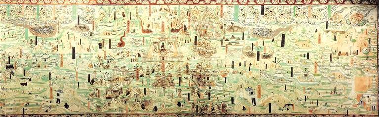 莫高窟61窟,建于五代晚期,是河西歸義軍節(jié)度使曹元忠及夫人開鑿的功德窟,又稱“文殊堂”,主要為供奉文殊菩薩而修。該窟的亮點(diǎn)是西壁的巨幅五臺(tái)山圖。這是敦煌壁畫中規(guī)模最大的山水人物圖,也是全景式歷史地圖。五臺(tái)山圖長13.6米,高3.5米,畫中詳細(xì)描繪了東起河北正定,西至山西太原,方圓五百里的山川地形及社會(huì)風(fēng)情,再現(xiàn)了五代時(shí)期五臺(tái)山佛國圣境的氛圍。
