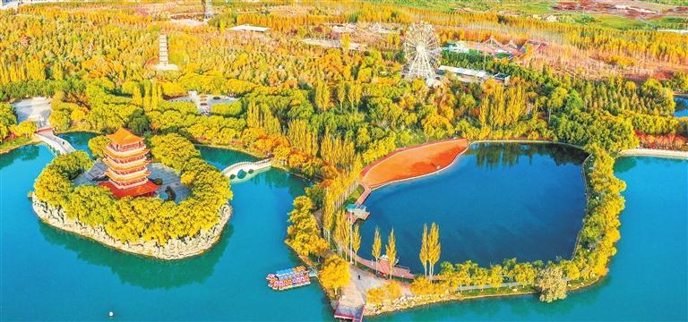 玉門市玉澤湖公園湖水澄澈,絢麗多彩。新甘肅·甘肅日?qǐng)?bào)記者 馮樂(lè)凱