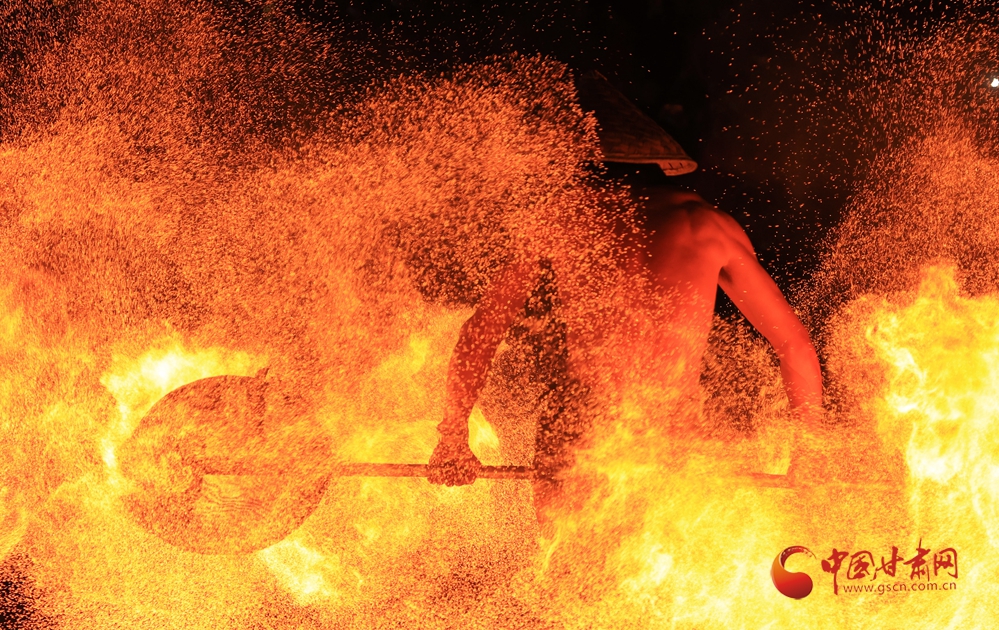 打鐵花表演時(shí),傳承人將生鐵熔到1600℃高溫后,把鐵汁注入“花棒”,用撬棍或木鍬猛擊,使鐵水打上天空四散,形成璀璨絢麗的火樹銀花景觀。