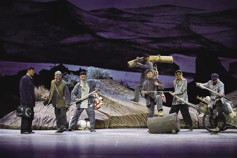 話劇《八步沙》別具匠心地從自然、歷史、人生三項(xiàng)維度,展現(xiàn)“六老漢”的奮斗歷程,再現(xiàn)“六老漢”三代人治沙的感人故事。劇中人物形象鮮明,表演真實(shí),質(zhì)樸感人,劇情節(jié)奏一氣呵成,舞美簡潔大氣,轉(zhuǎn)場(chǎng)巧妙,充滿戲劇沖突和懸念。