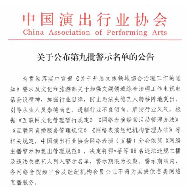 中國演出行業(yè)協(xié)會網(wǎng)絡表演(直播)分會近日發(fā)布了第九批網(wǎng)絡主播警示名單,包括“鐵山靠”“郭老師”兩名職業(yè)主播和“吳亦凡”“鄭爽”“張哲瀚”三名演員在內的88名主播將在行業(yè)內被實行聯(lián)合抵制和懲戒。這是違法失德藝人首次被納入網(wǎng)絡主播警示名單中,防止劣跡藝人轉移陣地復出。