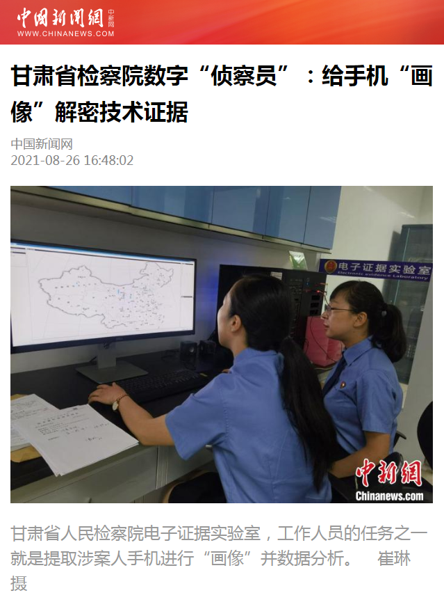2021年8月26日,中國新聞網(wǎng)發(fā)布新聞《甘肅省檢察院數(shù)字“偵察員”:給手機(jī)“畫像”解密技術(shù)證據(jù)》。