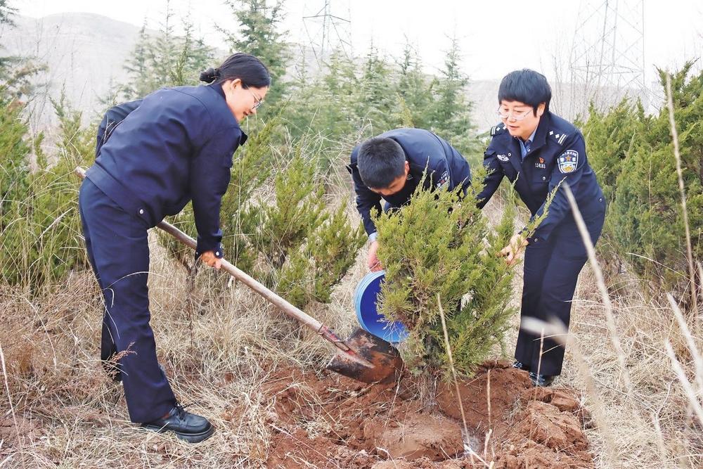民警植樹現(xiàn)場。近日,隴西縣公安局開展植樹活動,民警手持鐵鍬、鋤頭,分工協(xié)作,挖坑、栽樹、培土、澆水,在指定區(qū)域種下一棵棵樹苗,為大地增添新綠。 新甘肅·甘肅法治報通訊員劉恒杰攝