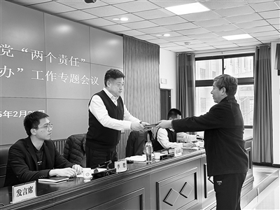 圖為河南省安陽市紀(jì)委監(jiān)委向派駐市水利局紀(jì)檢監(jiān)察組遞交2025年度全面從嚴(yán)治黨監(jiān)督責(zé)任清單,持續(xù)推動(dòng)“兩個(gè)責(zé)任”走深走實(shí)。王小山 攝