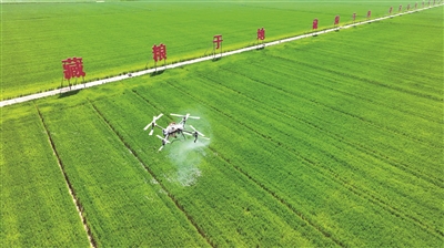 近年來,江蘇省宿遷市宿豫區(qū)多措并舉推動(dòng)耕地保護(hù)責(zé)任落實(shí),加快現(xiàn)代農(nóng)業(yè)產(chǎn)業(yè)園核心區(qū)建設(shè),保障糧食穩(wěn)產(chǎn)增產(chǎn)。圖為近日,在該區(qū)新莊小麥單產(chǎn)提升示范區(qū),無人機(jī)正在進(jìn)行植保噴灑作業(yè)。朱冠軍 攝