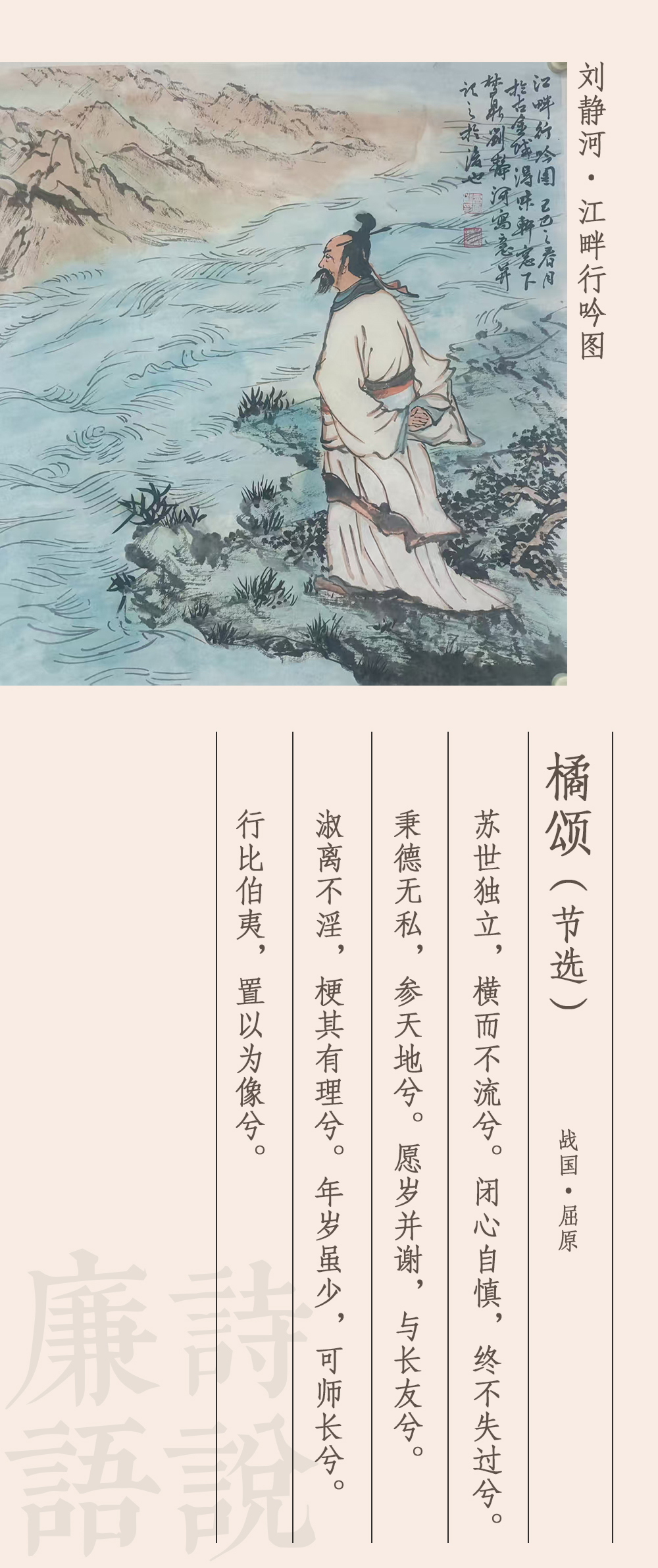 《橘頌》被譽(yù)為中國最早的詠物詩。據(jù)考證,屈原在流放之初,苦悶憤激,看到南國的橘樹,心有所觸,將橘樹人格化,賦予其君子仁人的品格,寫下了這首詩。詩分兩部分,前半部分寫實(shí),刻畫了橘樹的生長習(xí)性和枝葉花果,后半部分抒情議論,托物言志,橘人合一,情景交融。這里節(jié)選了后半部分,大意如下:清醒立世啊不隨波逐流,小心謹(jǐn)慎啊過失從不留,沒有私欲啊與天地比儔,我與你同生死啊永結(jié)為好友,你形象美好啊耿直作一流,你風(fēng)華正茂啊堪為好師長,你高潔比伯夷啊榜樣最優(yōu)秀。