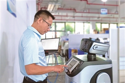 福建省福州市,服務(wù)機(jī)器人應(yīng)用技術(shù)員謝茂皇正在對(duì)機(jī)器人產(chǎn)品的功能進(jìn)行調(diào)試。周磊 攝