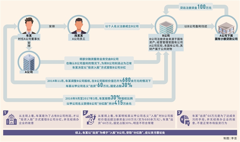 第二,車某的所謂出資行為并非市場(chǎng)投資行為,而是其利用職務(wù)便利獲取本屬于國(guó)有公司B公司的確定性預(yù)期收益的犯罪手段。本案中,車某明知其以甲公司名義“入股”時(shí),B公司實(shí)際資產(chǎn)高于注冊(cè)資金100萬(wàn)元。經(jīng)查,在車某以甲公司名義“入股”B公司時(shí),B公司實(shí)際股權(quán)價(jià)值為680余萬(wàn)元,車某“出資”60萬(wàn)元占股30%,明顯不符合常理,換言之,車某“出資”60萬(wàn)元不應(yīng)獲得30%股權(quán)。車某的真實(shí)目的是在不承擔(dān)市場(chǎng)風(fēng)險(xiǎn)的前提下,利用擔(dān)任A公司董事長(zhǎng)的職務(wù)便利,將A公司確定能夠盈利的融資業(yè)務(wù)交給B公司經(jīng)營(yíng),并在確認(rèn)B公司能夠盈利的情況下,以“出資”為幌子“入股”B公司,獲取“分紅款”,應(yīng)以貪污罪論處。