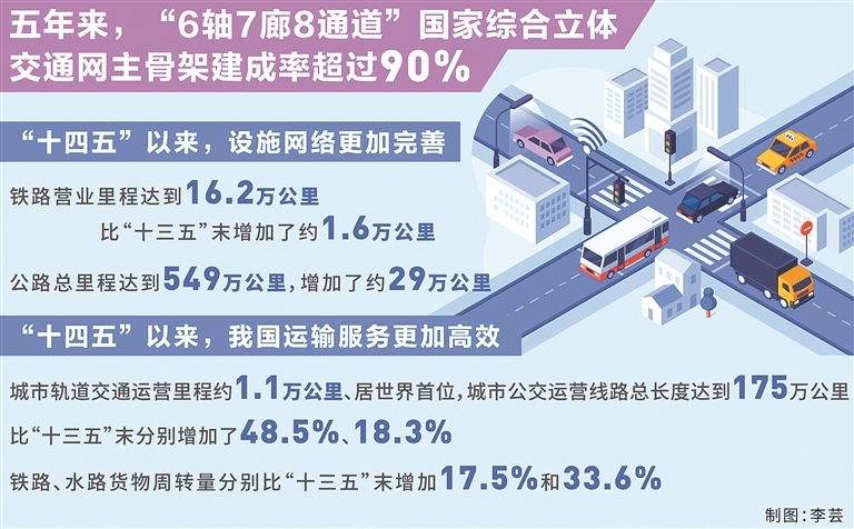 “人員貨物的高效流動(dòng)彰顯了中國(guó)繁榮發(fā)展的活力。在過(guò)去一年中,平均每天約有1.8億人次跨區(qū)域出行、每天運(yùn)送1.6億噸貨物、每天攬收4.78億件快遞。”劉偉說(shuō),“十四五”以來(lái),我國(guó)運(yùn)輸服務(wù)更加高效,軌道交通、常規(guī)公交、慢行交通網(wǎng)絡(luò)融合發(fā)展,城市軌道交通運(yùn)營(yíng)里程約1.1萬(wàn)公里、居世界首位,城市公交運(yùn)營(yíng)線路總長(zhǎng)度達(dá)到175萬(wàn)公里,比“十三五”末分別增加了48.5%、18.3%。鐵路、水路貨物周轉(zhuǎn)量分別比“十三五”末增加17.5%和33.6%,港口集裝箱鐵水聯(lián)運(yùn)量年均增速約15%。去年,全社會(huì)物流成本節(jié)約超過(guò)4000億元,其中交通運(yùn)輸成本降低了約2800億元。