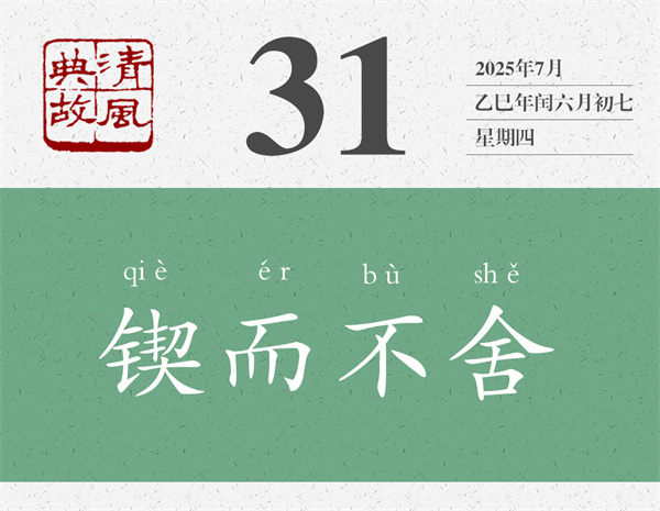 這段話中,為后人貢獻了好幾個典故,一個是“跬步千里”,一個是“鍥而不舍”。前者從“不積跬步,無以至千里”而來,不過只是反其意而用之,意思是,只要一步一步走下去,就能達到千里之遠。后者是從“鍥而不舍,金石可鏤”而來,意思非常清楚:一直雕刻而不停止,即使一塊金石也能雕刻成器。后即以“鍥而不舍”比喻有恒心,有毅力。章炳麟《菌說》:“夫固謂一人鍥而不舍,則行美于本性矣。”