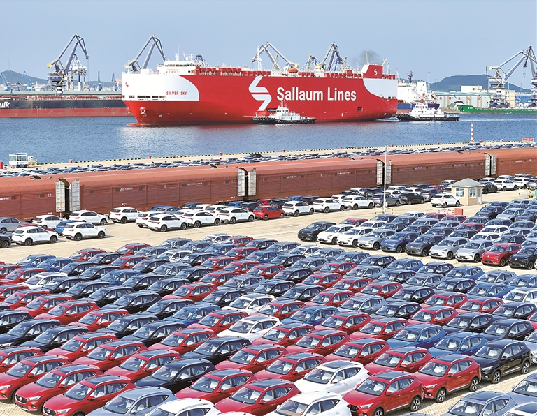 “十四五”時(shí)期,我國經(jīng)濟(jì)實(shí)力、科技實(shí)力、綜合國力躍上新臺(tái)階,中國式現(xiàn)代化邁出新的堅(jiān)實(shí)步伐,第二個(gè)百年奮斗目標(biāo)新征程實(shí)現(xiàn)良好開局。圖為近日,國產(chǎn)汽車在山東港口煙臺(tái)港集結(jié)等待裝船出口。新華社發(fā)(唐克 攝)