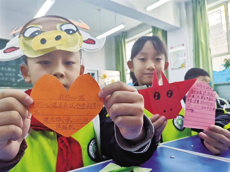 在西固區(qū)福利一小,老師們手拿小福牛在門口歡迎小福娃們回家,兩只萌翻全場的“福牛玩偶”也在熱情地和同學們打招呼。一進校門,老師、孩子們貼下自己新學期的愿望,并在“開學有獎”臺前,領取學校為老師和孩子準備的好運紅包。在操場上,孩子們在各年級的展板前貼下了制作精美的心愿卡,“希望新的一年我能堅持運動,做一個牛氣沖天的運動小達人”,“堅持閱讀,成為一個有學識的人”,“新學期,做一個守紀律、講禮貌的好孩子”……孩子們質樸的話語傳遞著新一年的奮斗目標。