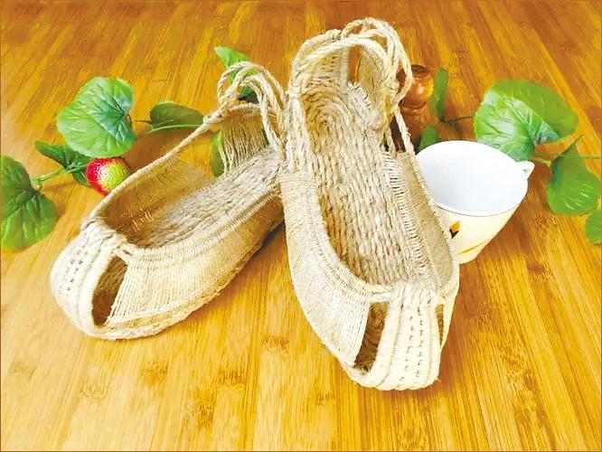 甘谷的麻制品生產(chǎn)至民國時期而達到極盛。麻鞋是主要產(chǎn)品之一,用純天然麻料、麻布、棉布及相關(guān)編織用具,以傳統(tǒng)手工工藝制成。將此前編成的麻辮置于一平案上,盤成底,復用麻繩左右穿緊。然后,像栽秧苗一樣,在鞋底的邊上栽上稍粗一些的麻繩,做成鞋幫,一一串起來,再做成鼻梁。這時,就得用一種清水人名曰楦頭的工具,把鞋鼓起來,一雙麻鞋的雛形,大抵就出來了。但還遠遠不夠,手工業(yè)者還要用一種專門用來編織的鉤針,鉤出麻花辮鞋面和鞋耳,做工前備染。制作時,先將大青麻編成辮,然后將麻辮置于平案,立辮狀盤鞋底,盤成麻絲緊密的“千層底”,再用麻繩穿緊左右,固定鞋底;最后用編織鉤針鉤出麻花辮鞋面、鞋耳、鼻梁,組合時用木楦把鞋撐起來,幫梁、鞋耳、鼻梁貫穿耐力麻繩,鞋就做好了。