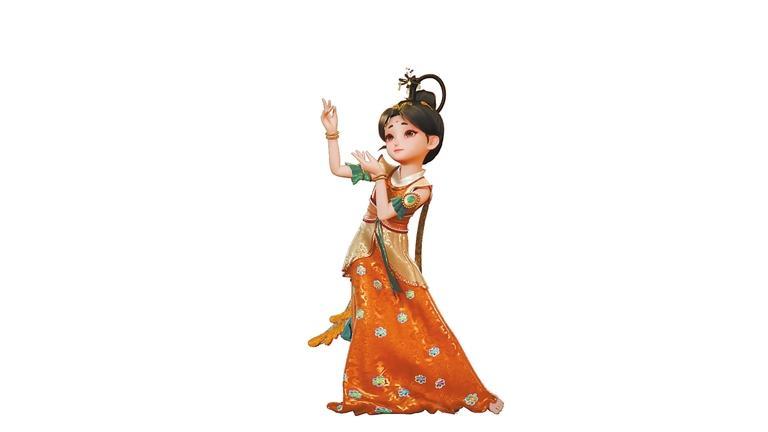 據(jù)制作團隊介紹,伽瑤項鏈的鑲嵌工藝、腰帶的打結(jié)方式,都參考了壁畫和史料進行還原。裙身紋樣則綴以大量的花朵元素,用莫高窟壁畫上的葉形瓣紋營造出花團錦簇的氛圍,蘊含著花開富貴、錦上添花、月圓花好等美好寓意。除了花朵,擇取“迦陵頻伽”的靈感,衣服上亦可見神鳥羽毛的圖案。項鏈的制作工序為唐代的鑲嵌工藝。于細節(jié)處,深度還原了其材質(zhì)和質(zhì)感。類似的考究細節(jié)還有很多,比如伽瑤如飛天一樣赤腳,臂釧比手環(huán)粗一些,腰帶打結(jié)符合時代特點等。