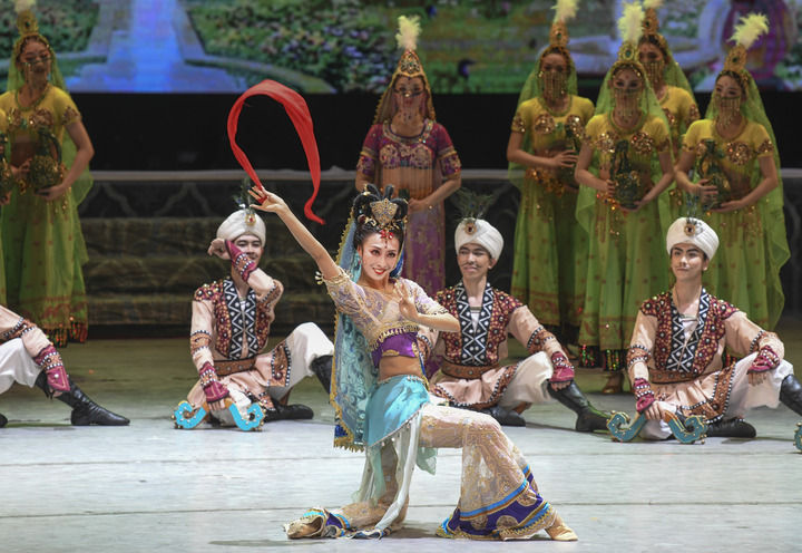 2023年1月2日,甘肅省歌舞劇院的演員在烏魯木齊京劇院表演舞劇《絲路花雨》。新華社記者 王菲 攝