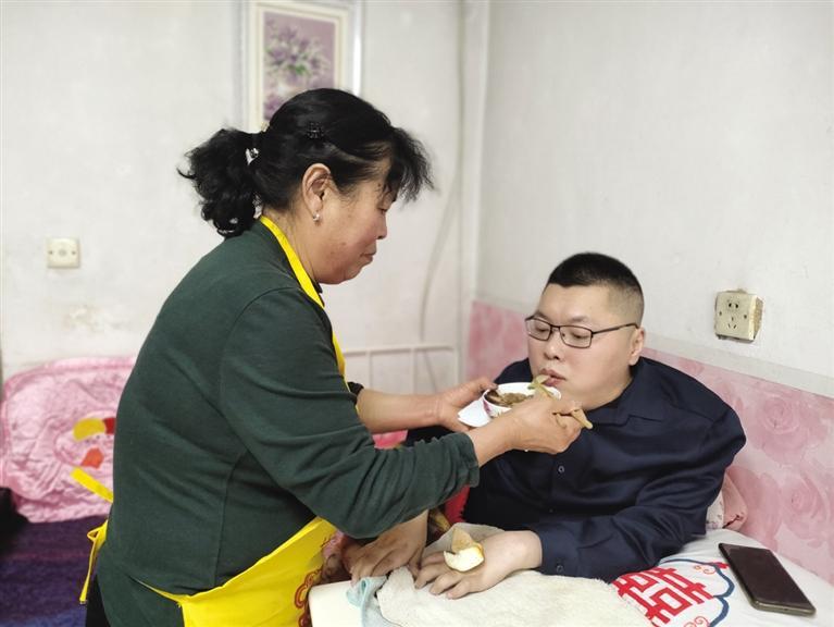 每年2月28日是國際罕見病日。這一天,呂元明要帶著他的愛心志愿團(tuán)隊(duì)去看望海石灣其他罕見病患者。每次出門之前,母親明秀蓮都要照顧呂元明起床、上廁所、吃飯。為了免去外出上廁所的麻煩,他常常一整天都不喝水。出門前,呂元明要母親給他刮了胡子,打了發(fā)膠,穿上了皮鞋、襯衫、夾克,在外面還套上了一件印有“隴愛社會(huì)工作服務(wù)中心”字樣的紅色馬甲。母親明秀蓮邊給他梳頭發(fā)邊說:“元明現(xiàn)在可愛臭美了,夏天出門還要戴一個(gè)蛤蟆鏡呢!”穿戴整齊完畢,母親便會(huì)一手扶著他的脖頸,一手托著腰身,深吸一口氣,借著慣性快速使力,將自己39歲的兒子抱起,再抱進(jìn)輪椅,然后調(diào)整位置,系上綁帶,將兩只瘦小的腳放在踏板上,幫助他將兩根能動(dòng)的手指搭在輪椅上……每次,明秀蓮會(huì)累出一身汗。“元明是我從小抱到大的,其他人不一定能抱動(dòng),這都是有‘竅門’的。”她笑著說。呂元明的成長過程幾乎從來沒有離開過母親的陪伴。母親對(duì)他來說,是他的腿、是他的眼,是朋友、是助手,更是面對(duì)生活的勇氣。