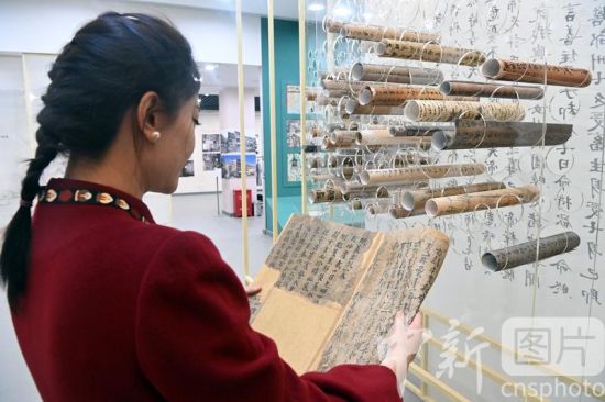 3月14日,敦煌研究院敦煌文獻(xiàn)研究所所長(zhǎng)趙曉星接受中新社記者專訪介紹稱,全彩印《敦煌文獻(xiàn)全集》出版工作已正式啟動(dòng),該叢書(shū)采用全彩印的方式刊布敦煌文獻(xiàn),實(shí)現(xiàn)敦煌文獻(xiàn)在線下圖錄中的高清還原。敦煌文獻(xiàn),又稱敦煌遺書(shū),是指1900年在甘肅敦煌莫高窟藏經(jīng)洞發(fā)現(xiàn)的公元4世紀(jì)至11世紀(jì)的寫(xiě)本、印本和拓片等文獻(xiàn)。據(jù)最新統(tǒng)計(jì)顯示,其總數(shù)近7萬(wàn)件。目前這些文獻(xiàn)分藏于中、英、法、俄、日等國(guó)的數(shù)十家收藏機(jī)構(gòu),一直缺乏完整的聯(lián)合目錄。圖為3月3日,工作人員在敦煌藝術(shù)館卷軸墻前閱覽敦煌遺書(shū)影印品。 中新社記者 九美旦增 攝