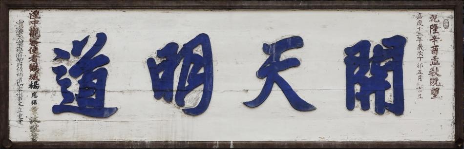 該匾懸于天水伏羲廟大門前牌坊正中。長(zhǎng)3.5米,寬1.25米,厚0.12米。素邊,匾心白底藍(lán)字,上下款朱書。此匾有雙上款和雙下款。第一個(gè)上款為“乾隆辛酉孟秋既望”,下款為“湟中觀察使者遼海楊應(yīng)琚薰沐敬書”;第二個(gè)上款為“嘉慶十二年歲次丁卯五月吉旦”,下款為“中憲大夫?qū)幭母蜓a(bǔ)知秦州事王公重建”。