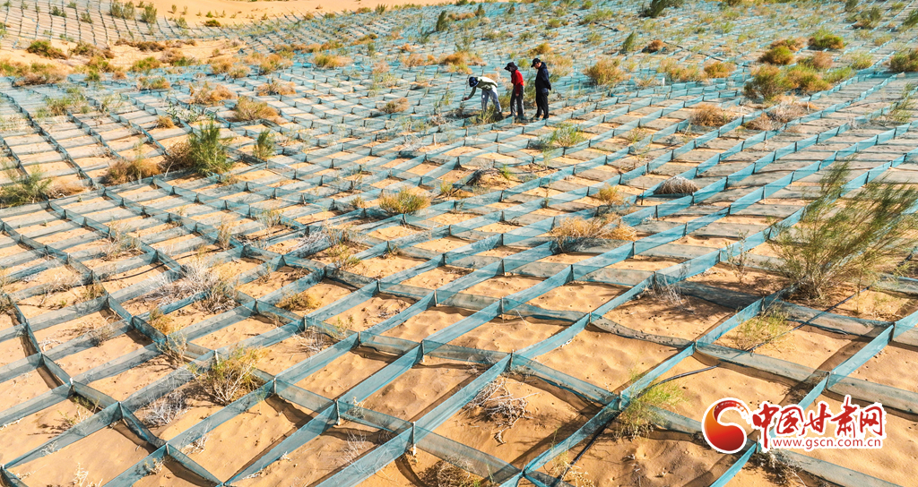 連日來,甘肅省張掖市臨澤、高臺北部荒漠區(qū)防沙治沙區(qū)內(nèi),群眾在防沙治沙工程現(xiàn)場共同壓沙障、栽梭梭、澆水管護(hù)、筑牢“阻沙網(wǎng)”,塑緊“防沙衣”,連綿起伏的沙漠上,麥草方格沙障一望無際,栽植的梭梭等植物迎風(fēng)挺立,煥發(fā)蓬勃生機(jī)。