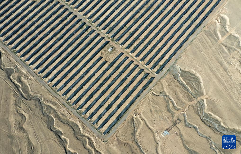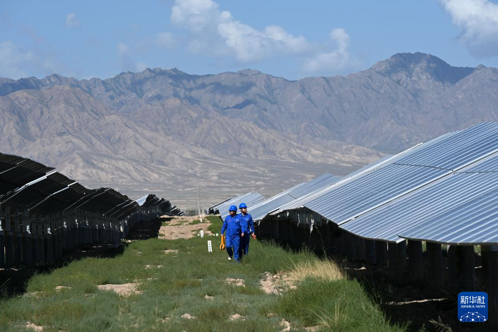8月11日,工作人員在中國能建張掖甘州南灘30萬千瓦光伏發(fā)電項(xiàng)目巡檢。新華社記者 金良快 攝