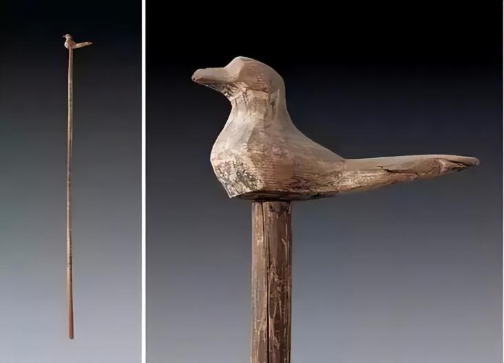 木鳩是王杖的杖首。在武威市博物館里,就有一件國寶級文物漢代彩繪漆木鳩:一只臥姿木質鳩鳥,雙目平視,口中含物,兩翼收攏于背部,尾呈平行片狀,兩足曲伸,中有方形卯,為杖桿接榫處。通體墨彩繪制,從頸至腹繪魚鱗狀羽毛,兩翼及尾上部繪魚骨狀羽毛。《后漢書·禮儀志》中記載:“王杖長九尺,端以鳩鳥為飾。鳩者,不噎之鳥也。欲老人不噎。”,“鳩”同于漢字“九”,有九九長壽的寓意;鳩鳥被稱為不噎之鳥,表達了對老人吃飯不噎、身體康健的美好祝愿。