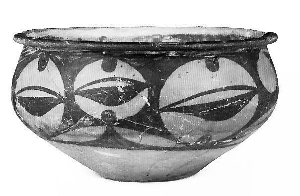 展廳陳列的寬帶紋缽、魚紋盆、彩陶葫蘆瓶主要是仰韶早期彩陶的代表作。其中魚紋圖案是仰韶文化的標(biāo)志性紋飾,從最初的寫實(shí)風(fēng)格演變到抽象化、簡單化。陳列的幾件魚紋盆清晰地顯示了這個(gè)變化過程。中期彩陶構(gòu)圖以弧線為主,線條流暢柔美,圖案華麗精巧。常見紋飾有弧形三角紋、迴旋勾連紋、花瓣紋等,表現(xiàn)出大自然生機(jī)勃勃、欣欣向榮的景象。展出的典型器有三角紋彩陶缽、網(wǎng)格紋彩陶盆、勾葉紋彩陶盆等。晚期彩陶數(shù)量雖呈下降趨勢,但工藝卻比中期更為成熟,大型彩陶器以及內(nèi)壁繪彩的制作方法開始出現(xiàn)。常見的紋飾有弧邊三角形、圓點(diǎn)圓圈紋、漩渦紋、網(wǎng)格紋等,還有個(gè)別蛙紋、犬紋。鋸齒紋彩陶壺、花瓣紋彩陶盆、弧三角網(wǎng)格紋盆均為這個(gè)時(shí)期的精品佳作。該時(shí)期流行的一些彩陶元素如內(nèi)彩、鋸齒紋、平行線紋、漩渦紋等被后世的馬家窯文化吸收繼承并發(fā)揚(yáng)光大。