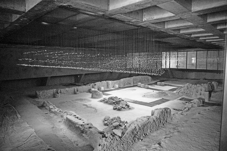 在遺址的半山中心位置有一座微微隆起的現(xiàn)代建筑,下面是被保護(hù)的大型宮殿式建筑——F901,該建筑屬于第四期文化,即仰韶晚期,約距今5000年,是目前所見我國新石器時(shí)代面積最大、工藝水平最高的房屋建筑。F901以長方形主室為中心,主室面積131平方米,東西中軸線長16米、南北中軸線寬8米。兩側(cè)擴(kuò)展為與主室相通的東西側(cè)室,左右對稱;主室后面設(shè)單獨(dú)的后室,前面有附屬建筑,前后呼應(yīng)、主次分明,形成一個(gè)結(jié)構(gòu)復(fù)雜、布局嚴(yán)謹(jǐn)、占地總面積達(dá)420多平方米的建筑群體。其居住面大部分保存完好,以輕骨料、砂石、料姜石粉混凝而成的類似現(xiàn)代水泥地面,光潔而堅(jiān)硬,它是大地灣乃至清水河沿岸的原始部落的公共活動(dòng)中心——一座宏偉而莊嚴(yán)的部落會堂。