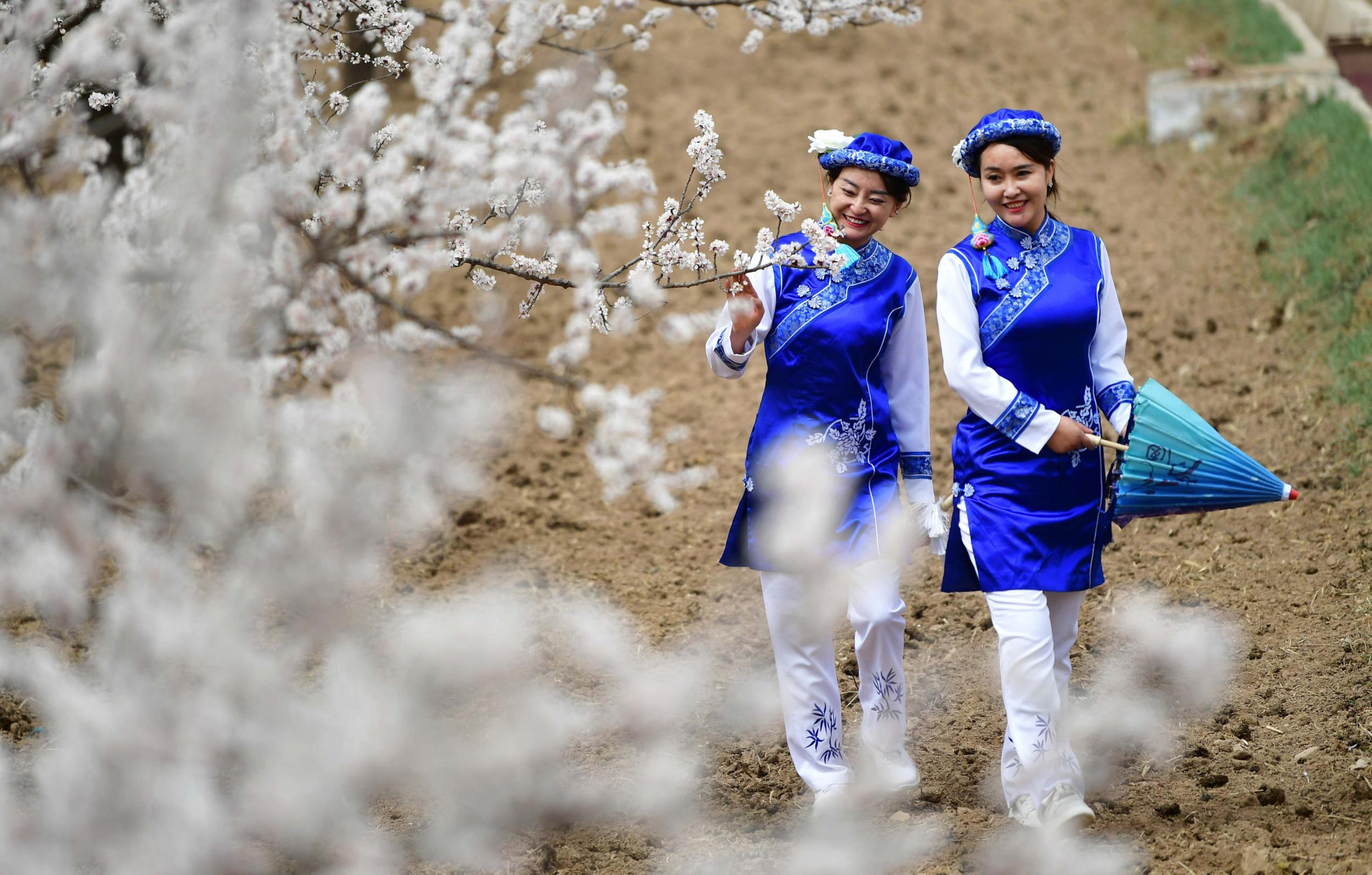 素有“隴上杏花第一村”美譽(yù)的甘肅省臨夏回族自治州東鄉(xiāng)族自治縣唐汪鎮(zhèn)杏花競相綻放,吸引了眾多當(dāng)?shù)厝罕姾陀慰吞で噘p花。新華社記者陳斌攝