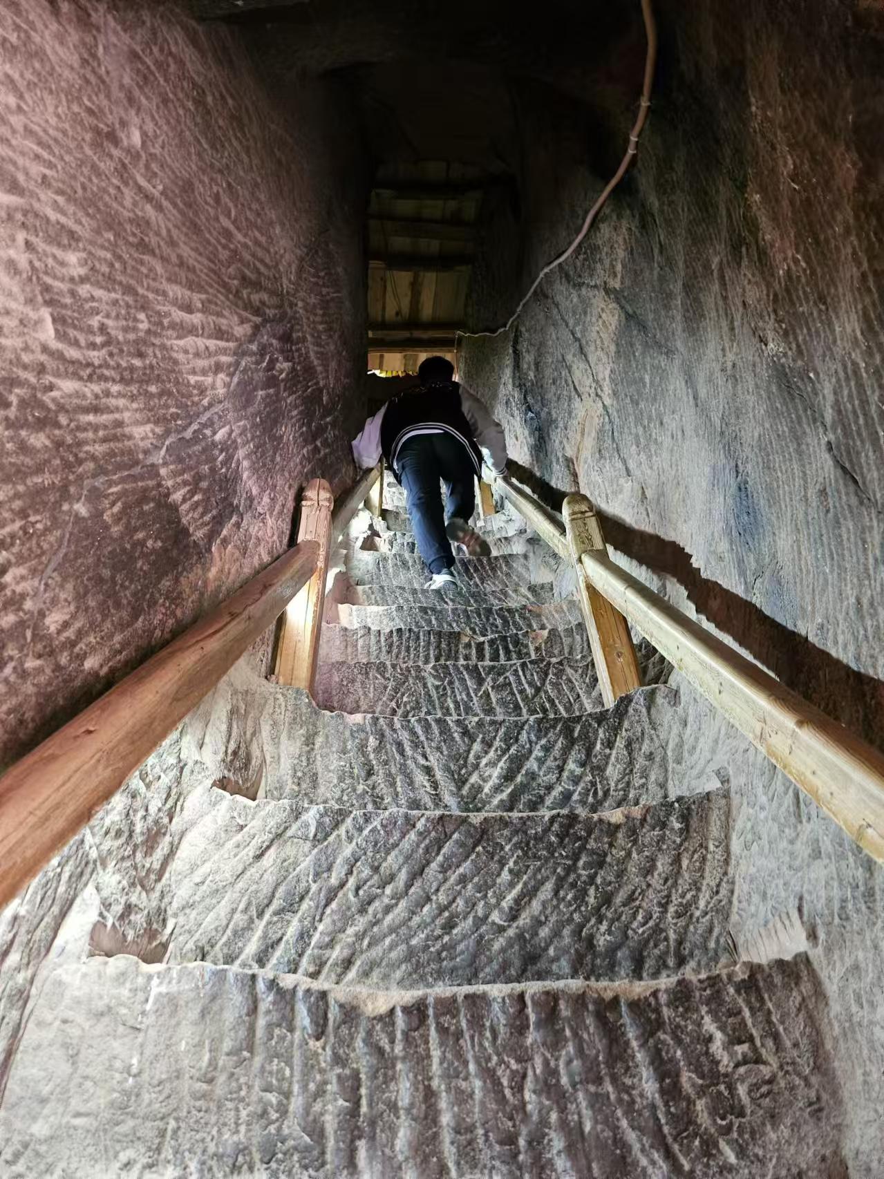 由第一層的北邊入內(nèi),隧道呈“之”字形,回廊曲折。里邊只能容納一個人行走,兩個人并坐,一共上去有129個臺階。石窟中的石砌臺階百轉(zhuǎn)千回,高低不一,不少階梯需要手腳并用才能上去,其艱難程度激發(fā)了游客的攀登欲,也有了“不到長城非好漢,不登三十三天真遺憾”的說法。