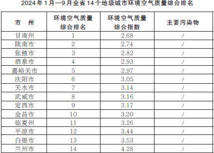 2024年1月—9月,全省14個地級城市環(huán)境空氣質(zhì)量綜合排名由高到低分別為:甘南州、隴南市、張掖市、酒泉市、嘉峪關(guān)市、慶陽市、天水市、武威市、定西市、金昌市、臨夏州、平?jīng)鍪?、白銀市、蘭州市。