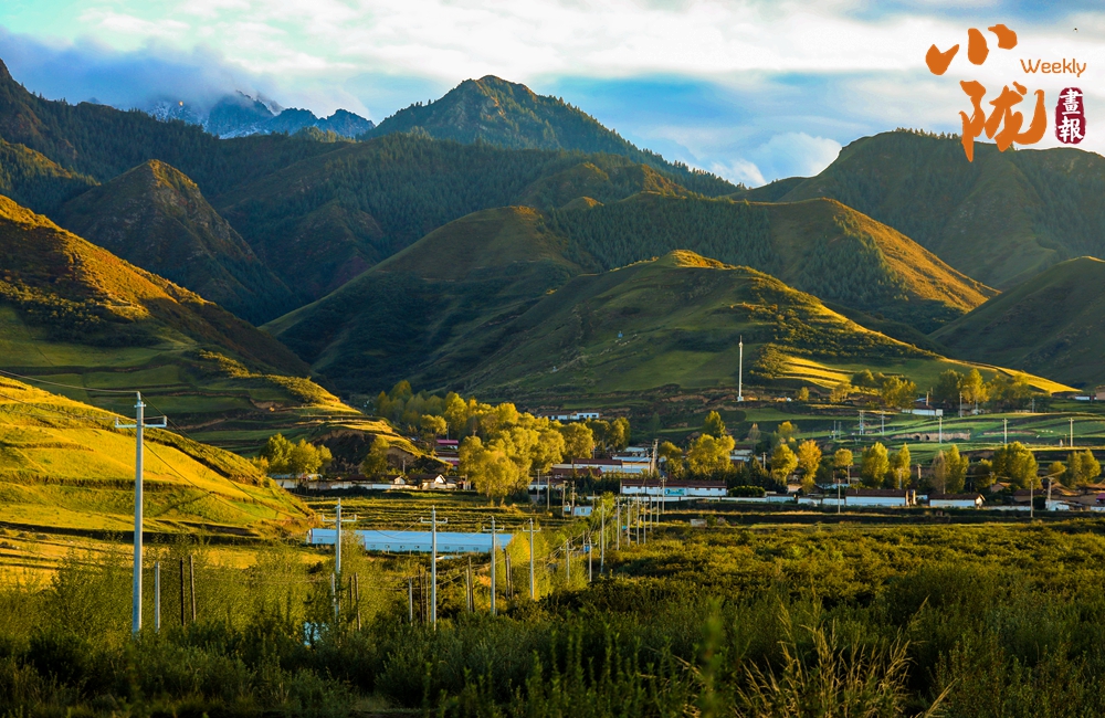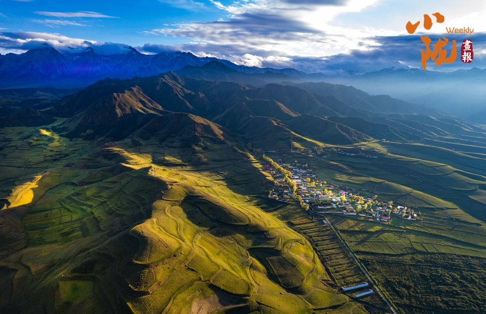 秋風(fēng)溫柔,山川壯美。祁連山腳下,泛黃的草原如同大地鋪開的地毯,伸向天際。遠(yuǎn)處的山川,近處的村莊、樹木沉浸在金色的光芒中,一幅五彩斑斕的秋景圖。