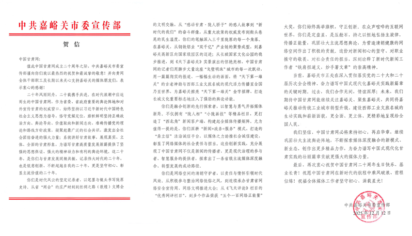 中國甘肅網(wǎng)12月12日訊(西北角·中國甘肅網(wǎng)記者 宋芳科)值中國甘肅網(wǎng)成立二十周年之際,中共嘉峪關(guān)市委宣傳部特向中國甘肅網(wǎng)發(fā)出賀函,致以最熱烈的祝賀與最誠摯的敬意,高度肯定二十年來中國甘肅網(wǎng)為嘉峪關(guān)新聞宣傳事業(yè)、輿論引導(dǎo)工作作出的重要貢獻(xiàn),并對長期以來的支持表示衷心感謝。