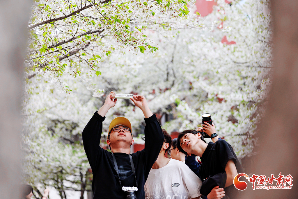 4月5日,學生們在蘭州大學校園內(nèi)拍攝櫻花。