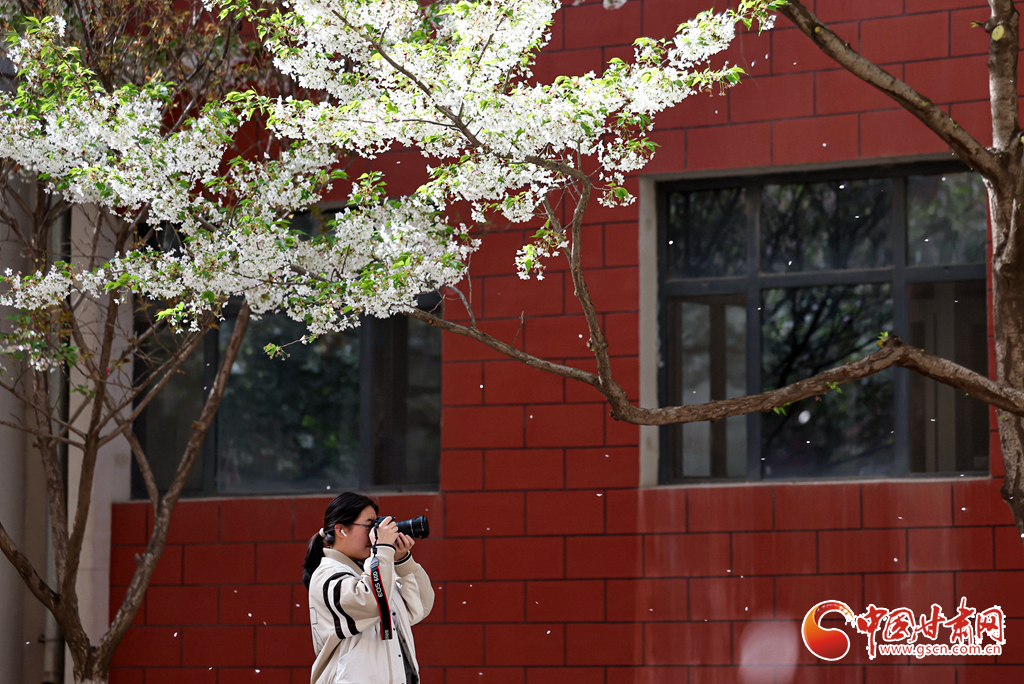 4月6日,攝影愛好者在甘肅蘭州大學校園內(nèi)拍攝櫻花。