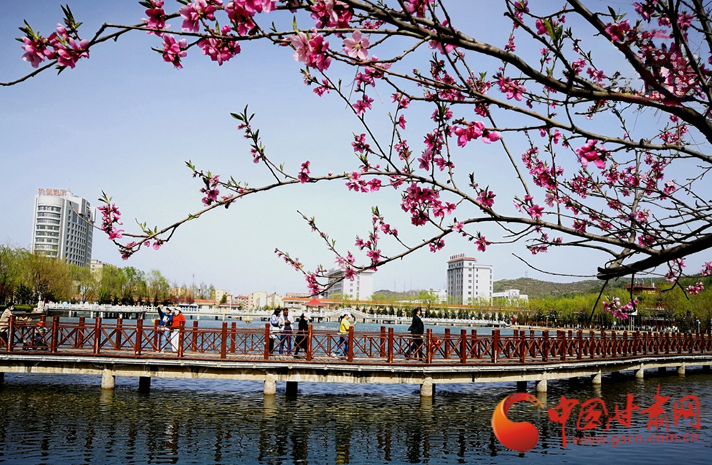 蓮湖岸畔,粉艷桃花垂枝映水,棧橋上行人悠然漫步,樓宇靜立,一派生機盎然
