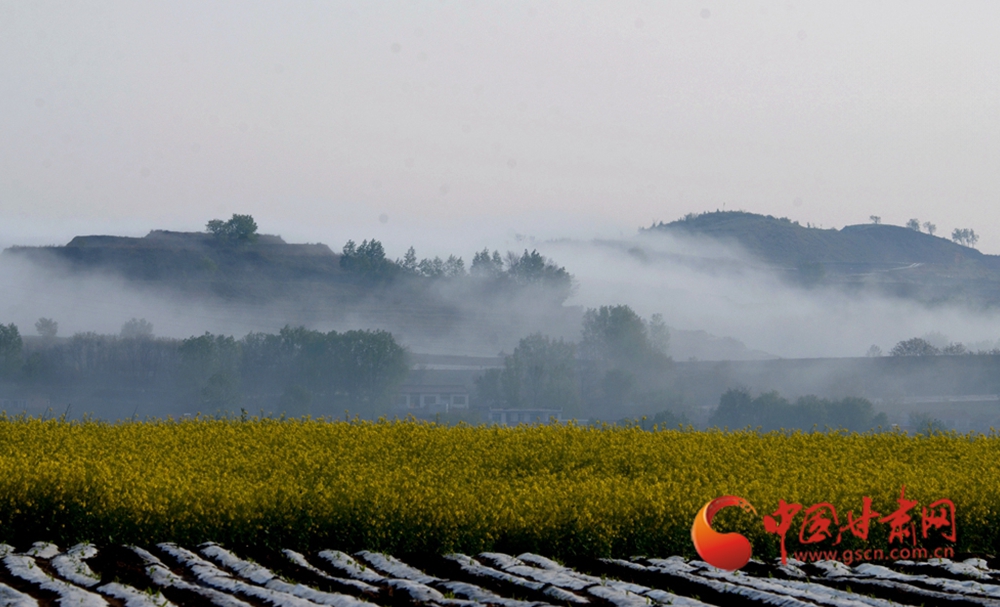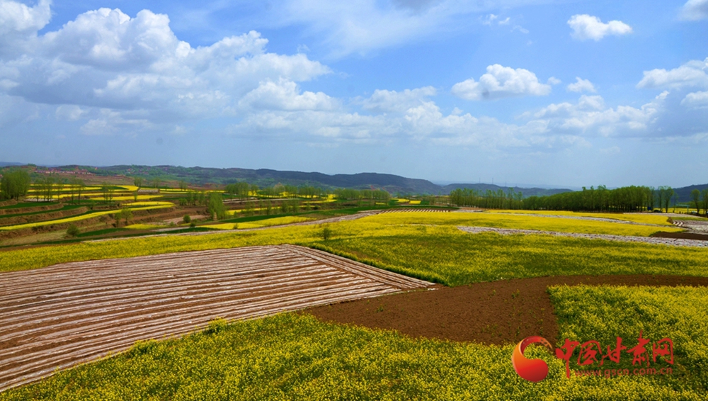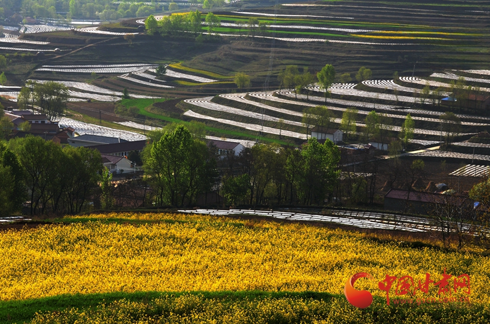 金黃的油菜花田與層層梯田相映成趣,錯落的村落掩映在綠樹間,這是黃土坡上的春日盛景
