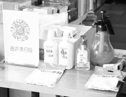 中原圖書大廈服務(wù)臺為讀者準備的掃碼處和防疫消毒用品。