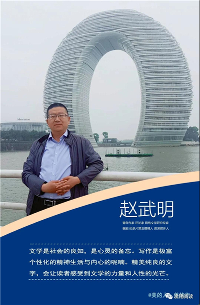 趙武明,曾用筆名丹心、牧星等。金城文化名家、青年作家、評(píng)論家、網(wǎng)絡(luò)文學(xué)研究專家、編劇、紀(jì)錄片策劃撰稿人、資深媒體人。中國散文學(xué)會(huì)會(huì)員、中華散文網(wǎng)創(chuàng)作委員會(huì)副主席、甘肅省網(wǎng)絡(luò)作協(xié)副主席,甘肅省八駿文藝人才研究會(huì)副秘書長兼文學(xué)委員會(huì)主任等,曾在魯迅文學(xué)院中青年作家班學(xué)習(xí)。在多家報(bào)刊雜志網(wǎng)絡(luò)開設(shè)專欄。發(fā)表各類文學(xué)作品數(shù)百萬字,曾獲國內(nèi)外多項(xiàng)文學(xué)大獎(jiǎng)及新聞獎(jiǎng),擔(dān)任國內(nèi)多項(xiàng)文學(xué)大賽評(píng)委。唯美散文作家代表。部分作品被選入各種文集,并被設(shè)計(jì)成中高考閱讀試題。
