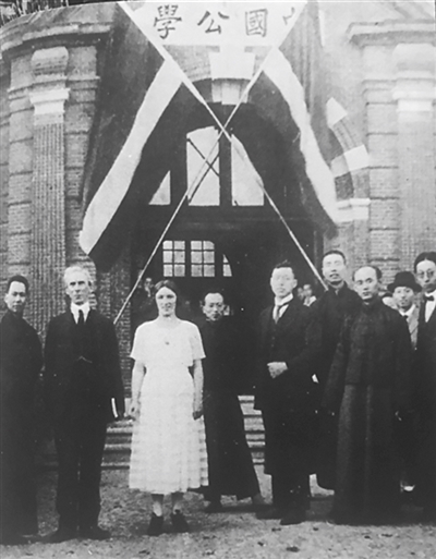羅素(左二)與勃拉克在中國公學(xué)前合影。