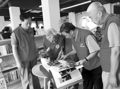 社區(qū)退休黨員在“紅旗書屋”里翻看大型圖冊(cè)《中國(guó)》。