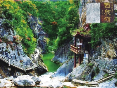 由于路況寬闊平整,從成縣縣城驅(qū)車西行二十分鐘至東入口,便來到了號稱青山綠水間的書法博物館的魚竅峽,這里就是著名的西狹頌風(fēng)景區(qū)。“光怪靈潭氣欲春,波平浪靜一輪存。鏡連五色龍成彩,珠映千鱗月映痕。”果然,這方寶地清幽綺麗,青山對峙,澗流清澈。峽內(nèi)的山、水、石、樹,皆成風(fēng)景;亭、橋、廊、榭,相映成趣。舉目環(huán)望,山崖上綠樹層疊,其間亦或有古樹參天,老藤纏繞。兩山之間的響水河,或在峽谷中潺潺繞行,或在巨石間沖騰奔瀉,浪花激起的水聲。更美的是懸崖上的水,化成一條白練從高處垂落而下,直泄黃龍?zhí)?。西峽飛瀑“龍?zhí)队吃?rdquo;便成為成縣著名的八景之一,至今為世人津津樂道,贊嘆不已。