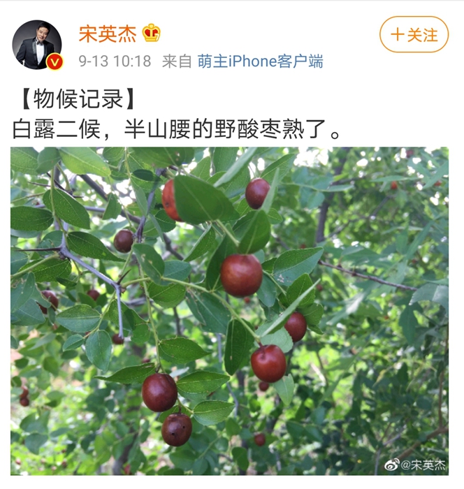 如今,他仍然會隨手在社交媒體上記錄四時風物的變化,前幾天發(fā)了一張照片,配文“白露二候,半山腰的野酸棗熟了。”對他而言,隨時關(guān)注氣候與物候,已經(jīng)成為一種習慣。(完)