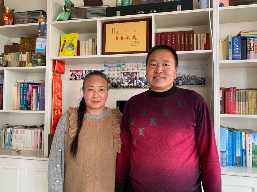 2020年12月10日,牧民敖特根達(dá)來和妻子在自家“書香家庭”獎牌前合影。新華社記者 朱文哲 攝