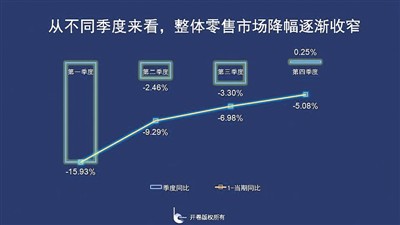 從時間軸來看,整體零售市場第一季度受疫情影響最為嚴(yán)重,同比下降15.93%,二季度復(fù)工復(fù)產(chǎn)復(fù)學(xué)急速收窄降幅,三季度同比下降3.3%,降幅略增,到第四季度回暖,同比出現(xiàn)小幅上漲,上升了0.25%。