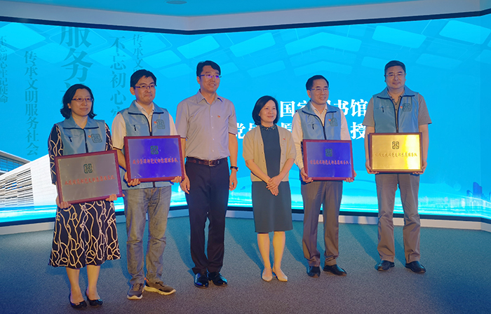 6月8日上午,國(guó)家圖書館新閱讀空間開放暨黨員志愿服務(wù)總隊(duì)成立活動(dòng)在國(guó)家圖書館總館北區(qū)舉行?;顒?dòng)現(xiàn)場(chǎng),國(guó)家圖書館黨委書記、副館長(zhǎng)魏大威,國(guó)家圖書館副館長(zhǎng)、黨委副書記陳櫻為4支黨員志愿服務(wù)分隊(duì)代表授牌。