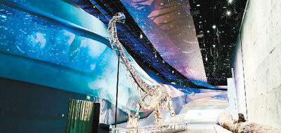 進(jìn)入展廳,人們首先會(huì)被來(lái)自侏羅紀(jì)時(shí)代的龐然大物——中加馬門(mén)溪龍化石所震撼。馬門(mén)溪龍是中國(guó)發(fā)現(xiàn)的體型最大的蜥腳類(lèi)恐龍之一,頸部特別長(zhǎng)。這具化石出土于新疆奇臺(tái)縣,2016年修復(fù)裝架完成,高7.5米,長(zhǎng)24米,脖子就有12米長(zhǎng)。