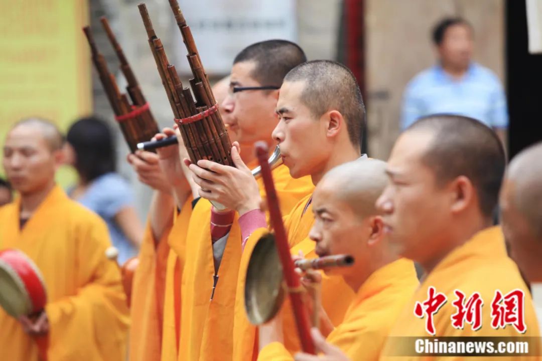 2011年7月,在山西五臺(tái)山南山禪寺,僧人演奏漢傳佛樂(lè)。中新社記者 韋亮 攝