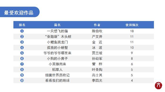 2021年度十大作品榜單為:《一只想飛的貓》(作者陳伯吹)、《“歪腦袋”木頭樁》(作者嚴(yán)文井)、《小鯉魚跳龍門》(作者金近)、《孤獨(dú)的小螃蟹》(作者冰波)、《爺爺?shù)臓敔斈睦飦怼?作者賈蘭坡)、《小狗的小房子》(作者孫幼軍)、《小英雄雨來》(作者管樺)、《稻草人》(作者葉圣陶)、《細(xì)菌世界歷險(xiǎn)記》(作者高士其)、《看看我們的地球》(作者李四光)。