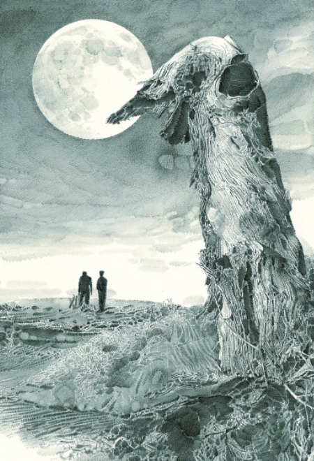 一輪滿月在大漠天空中懸浮著,兩個(gè)人行至遠(yuǎn)方的沙地,并肩好似在暢談著什么??窃凇蹲x者》2019年第五期的這幅插圖,出自魯迅美術(shù)學(xué)院教授李晨之手,他以寫實(shí)的素描手法為陳忠實(shí)的文章《毛烏素沙漠的月亮》配圖,畫面細(xì)膩而充滿想象空間。